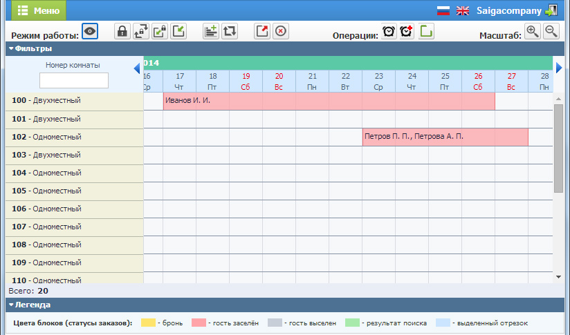 Центральным управляющим звеном системы является шахматка-календарь, позволяющая на основе графического интерфейса фиксировать все операции. При этом она является точкой доступа ко всей информации как о гостях, так и номерном фонде.