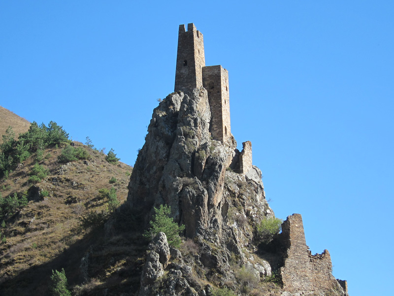 Пожалуй, это один из самых ярких и экзотических башенных комплексов среди других известных строений древней Ингушетии. Он расположен на высоких гребнях сланцевых скал ущелья реки Гулой-хи и состоит из двух отдельных замков, соединявшихся когда-то подвесным мостиком. Основу каждого из замков составляют одна и две боевые четырехэтажные башни с плоскими крышами и высоким парапетом. Заградительные стены, ограничивавшие доступ к строениям, органично вписаны в естественный рельеф неприступных скал.