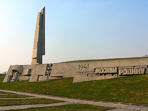«1941. Здесь защитники Москвы, погибшие за Родину, остались навеки бессмертны».На вершине кургана, высота которого 27 м, устремлен ввысь обелиск в форме трех сомкнутых штыков. Они символизируют стрелковые, танковые и кавалерийские части (высота 42 м от вершины кургана). До открытия монумента на могиле стояла пирамидка.Авторы проекта: архитекторы И.А. Покровский, Ю.А. Свердловский, скульптор Е.А. Штейман-Деревянко, художник А.Г. Штейман, инженер Д.М. Хатуцкий.