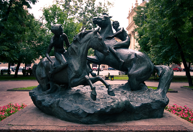 Перед зданием находится необычная скульптурная группа «Юность (Купание лошадей)», Р.С. Кирилловой, известной своей страстью к лошадям.