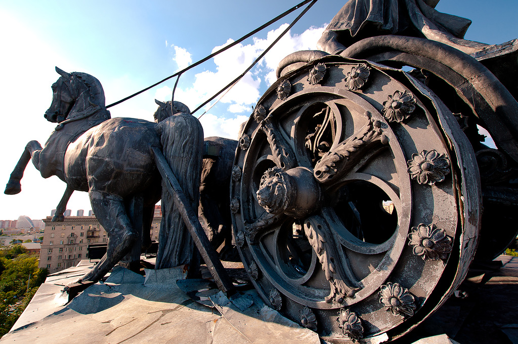 Хотя новое здание в духе сталинского ампира тоже довольно изящно. Несмотря на размеры конструкции, здание смотрится хрупким. Этот визуальный эффект достигается благодаря принципу «весов»: на одной стороне здания изящная башенка, а на другой – колоннада, символизирующая мощь страны советов. Колоннада немного напоминает Брандербургские ворота в Берлине.