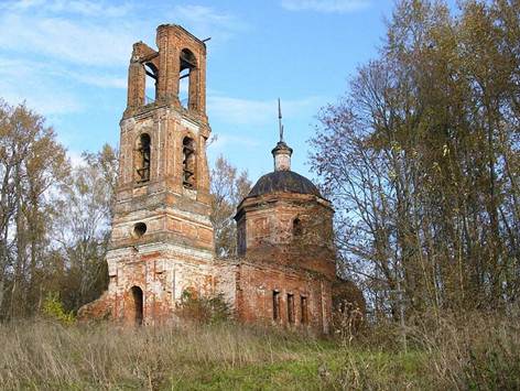 Здесь была деревня Лавреньки, она сгинула еще до войны 1941-1945 гг., а единственное что осталось - две небольшие пустоши и яблони с бузиной. Центральная точка холма находится сразу за церковью 1812 года постройки.