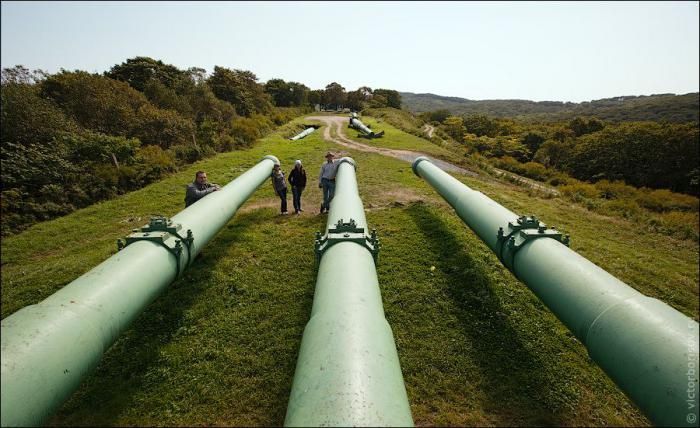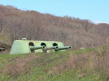 Батарея располагается в южной части острова Русский, в 400 м от юго-западного берега кутовой части бухты Новик. Батарея состоит из двух башен с тремя орудиями каждая. Для одного выстрела требовалось два полузаряда весом 76 и 32 кг. При строительстве батареи и для подвоза снарядов использовали узкоколейную железную дорогу, построенную вдоль берега бухты Новик от построенного специально для этой цели причала к началу подъема к батарее. К настоящему времени от причала и железной дороги мало, что сохранилось, за исключением большого полуразрушенного здания депо и остатков насыпи. Орудия были сняты с линкора Полтава и после ремонта на Обуховском заводе, на котором были изготовлены еще до первой мировой войны, привезены, подняты и установлены на башни. Вес каждого ствола — 51 тонна. Диаметр — 350 мм. Вес вращающейся части каждой башни — 900 тонн, весь вес башни — 1200 тонн. На башнях установлена броня толщиной 300 мм. Вращение башен круговое. Углы наклона стволов от — 5 до +25 градусов. Максимальная дальность стрельбы 35 км. При этом высота полета снаряда на максимальной траектории составляла 11 км. Снаряды с дистанционным взрывателем позволяли стрелять и по воздушным целям. Скорострельность для одного орудия 1,5 выстрела в минуту. И это притом, что вес снаряда 470 кг (самый легкий — дальнебойный — 314 кг). Снаряды по типам разделялись на дальнебойные, полубронебойные и бронебойные, которые могли пробить броню толщиной 350 мм. Стрелять можно было 1 стволом, двумя, тремя стволами и всеми орудиями (6 стволов). Расчет одной башни — 75 человек, всю батарею, включая наблюдательный пункт и силовую установку, обслуживали — 399 человек. В целом, проходя по этажам, разглядывая сложные механизмы зарядных камор и стволов, ловишь себя на мысли, как красиво, функционально и добротно все это было сделано. А если учесть, что многим из этих мезанизмов уже более 80 лет мысленно снимаешь шапку перед инженерами и рабочими, сотворившими это чудо военной техники. Но, пожалуй, самое большое впечатление производит точность стрельбы из этих орудий — швартовая бочка, находящаяся на расстоянии 6 миль (1 морская миля — 1852 м) от батареи была уничтожена на последних практических стрельбах (1992 год) с третьего выстрела. При этом диаметр бочки составлял всего 2 м, то есть на таком расстоянии ее и разглядеть-то было практически невозможно! Разнообразна растительность острова. Не смотря на бурную человеческую деятельность, на острове все же удалось сохранить уголки нетронутой природы. Более половины территории острова покрыто парковыми лесами с ценными и декоративными деревьями, лианами, травянистыми растениями. Среди них абрикос, груша, вишня, диморфант, аралия, элеутерококк, лимонник, актинидии, лилии, орхидеи. Сейчас жителями острова активно ведутся лесонасаждения с целью восстановления «легких Владивостока». Как считают ученые, вырубка таежного массива на острове Русском привела к значительному изменению климата в городе. Животный мир острова так же интересен и разнообразен, он представлен дикими козами, лисами, бурундуками, ежами, различными птицами. Удивительны и живописны береговые и подводные ландшафты. Климат здесь муссонного типа, характерно влажное теплое лето и холодная сухая зима, сильные ветра.