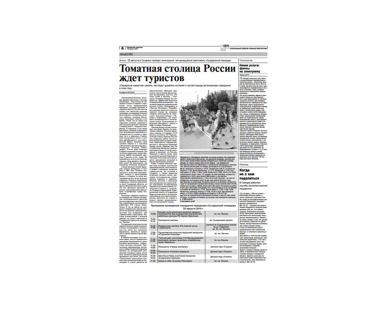 «Сызранский помидор» 2012, 2013 и 2014 годов особо отличались своей масштабностью. Специально для участия в празднике прибыли туристические электропоезда из г.Самары. В 2012 году в рамках праздника был организован инфотур с участием журналистов. Среди приглашенных – представители Российского союза туриндустрии, главные редакторы и руководители печатных и электронных СМИ, представители туристических компаний и органов власти в сфере туризма. В 2013 году жительница города Сызрань, победитель конкурса «Мисс Помидорка-2012» Екатерина Карсянова была приглашена на телеканал «Россия-2» для участия в передаче «О самом главном».