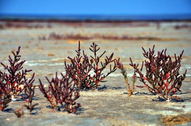 Уникальна растительность котловины озера Эбейты. За счёт сильного засоления здесь встречаются растения, приспособленные к жизни на солончаках. Некоторые из них ограниченно распространены в Омской области. Они характерны для более южных районов Западно-Сибирской равнины и в основном встречаются за пределами России в Республике Казахстан. Такие редкие виды включены в «Красную книгу Омской области». Одним из представителей местной флоры является солерос европейский – однолетнее травянистое растение, имеющее водозапасающую ткань в стебле. Прорастание семян солероса часто начинается весной под водой, когда соответствующий участок поверхности котловины ещё покрыт слоем солёной воды глубиной до 0,5 м. Побеги солероса европейского несут сильно редуцированные и почти незаметные листья. К осени растения солероса обычно сильно краснеют, что придаёт особый колорит местному пейзажу.