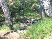 Поляна находится у русла реки и прикрыта полукольцом леса, словно амфитеатром. Здесь долгое время на поляне проходили различные культурные мероприятия. Даже сейчас сохранились пеньки, которые когда-то служили стульями для зрителей, и бревно, на котором и проходили различные турниры. Например, нужно было пройти по шатающемуся из стороны в сторону бревну, до самого конца. Мы это тоже попробовали сделать. Оказалось довольно просто. Тут 2 нюанса. Первый - нужно идти как можно быстрее по бревну и держать равновесие. Если идёшь медленно, то оно больше раскачивается и нужно затратить больше сил для удержания равновесия. А второй – это для тех, кто с большим весом. Чем больше вес человека – тем бревно наклоняется ниже к земле и меньше раскачивается.