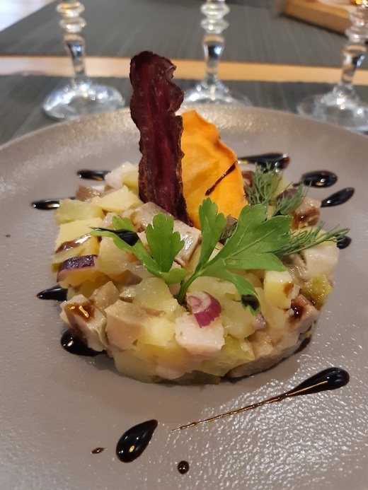 Пол-обеда позади, пора размяться для лучшего усвоения пермских блюд. Гид говорит о культурных, музыкальных традициях пермяков и приглашает гостей на танец «тупи тап»: выводит нескольких гостей из-за столов, показывает движения, все танцуют под веселую музыку.