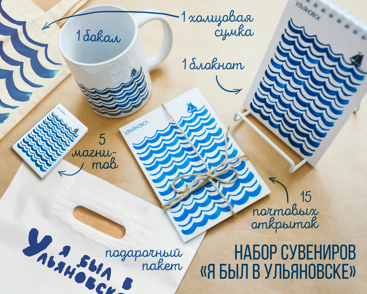 Этот набор был разработан как основная коллекция бренда сувениров "Я был в Ульяновске" (*). Заглавным изображением для этого набора является иллюстрация с волнами и корабликом. Широкая волна означает Волгу, узкая - Свиягу (также есть особенность, что располагаясь параллельно, эти реки текут в противоположном направлении, что является редкостью).