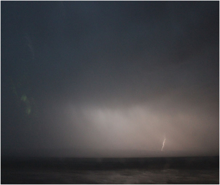 А вот дальше началось самое интересное, вернее необычное… по плану мы должны были из г.Дуз поехать в г.Таузар и по дороге полюбоваться заходом солнца на соляном озере Шотт-Эль-Джериж, но мы попали в страшную бурю! Если посмотреть на карту, дорога проходит прямо через это соляное озеро, и когда мы проехали половину пути, стемнело, поднялся ураган, поперек дороги ветер нес волны песка, пошел ливень, да такой… что видимость была практически нулевой! И самое главное: со всех сторон прямо в озеро вонзались молнии! Их было сотни! Только они и освещали дорогу, хотя от этого было не легче… Наш водитель вцепился в руль и всеми силами старался не съехать с дороги. Было достаточно жутко! Трудно было отделаться от мысли, что одна из молний запросто может попасть в машину! Причем, что интересно, обычно молния сопровождается громом, а тут… полная тишина, сотни молний со всех сторон и только барабанная дробь от дождя и завывание ветра! Мистика! Но все закончилось хорошо, мы благополучно доехали до Таузара, там была долгожданная цивилизация и отель со светом и горячей ванной! Но поездка эта запомнилась всем на долго! Я пытался фотографировать, но ничего не получилось… с нами в машине был фотокорреспондент Евгений Веденьев с хорошей профессиональной камерой, вот его фото: