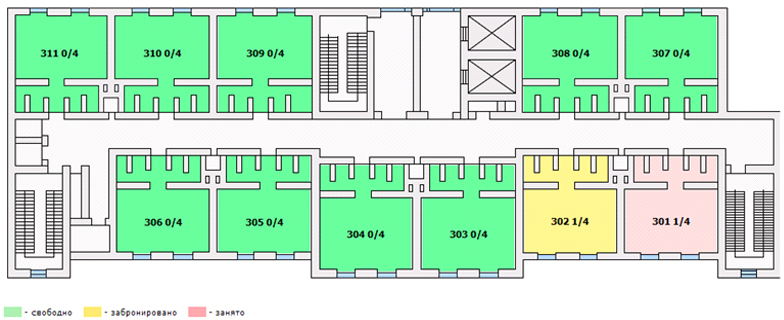 Одним из дополнительных модулей, используемых крупными отелями и относящимся к основной деятельности отеля, является модуль «Поэтажные планы», который позволяет с помощью поэтажных планов наглядно представлять местоположение комнаты на этаже и ее состояние (свободна, занята, не убрана и т.д.). Кроме того, комната на плане является активным элементом, т.е. при щелчке по ней можно посмотреть оснащение комнаты, ее фотографию, обратиться к данным проживающих гостей, оформить заказ дополнительных услуг.
