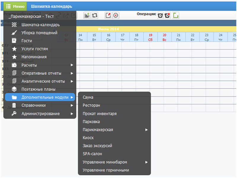 Группа однотипных модулей с некоторыми отличиями: сауна, парикмахерская, SPA-салон. Модуль «Сауна» обеспечивает наглядное представление сетки часов работы сауны с указанием свободных и занятых сеансов. Модуль «Парикмахерская» - это полнофункциональная подсистема управления, включающая управление персоналом, форму графического представления расписания обслуживания клиентов, учетом рабочих мест, материалов, возможностью заказа услуги через интернет. Модуль «SPA-салон» дополнительно включает возможность учета курсов процедур.