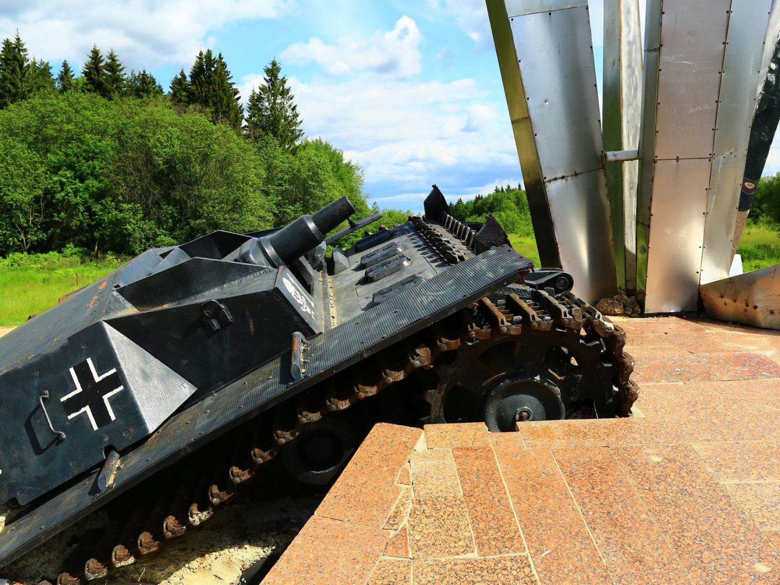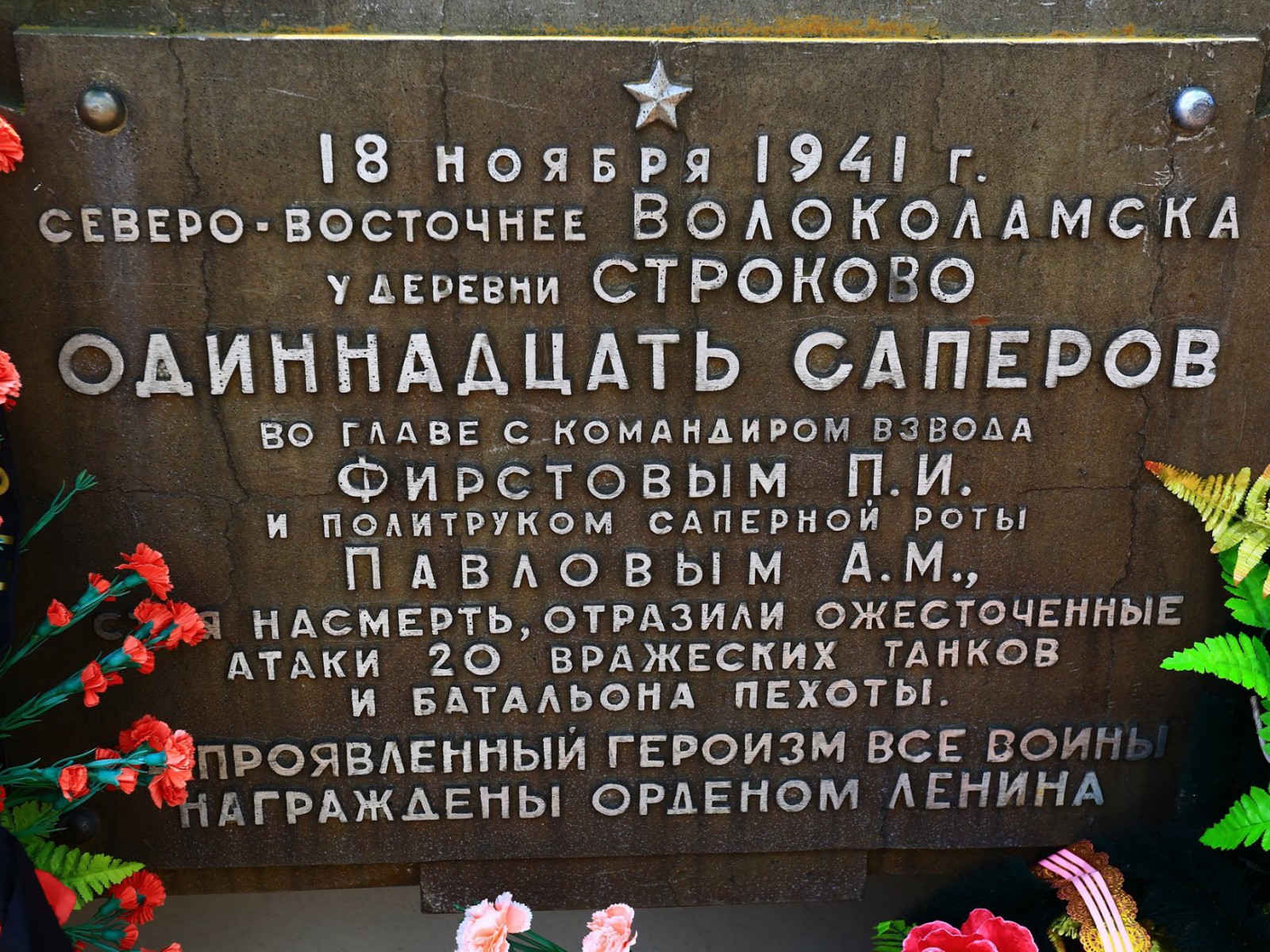 Где-то на сто четырнадцатом километре от Москвы, в таком шикарном месте, сделали первую остановку у памятника 11 саперам! 114-й километр Волоколамского шоссе - место памятное. Здесь у деревни Строково 16 ноября 1941 года сложили головы 11 саперов из дивизии генерал-майора Панфилова, прикрывавшие отход товарищей. На позиции красноармейцев наступала фашистская пехота, которую поддерживали 20 самоходно-артиллерийских установок «Штурмгешутц-3» - проще говоря, «Штуг». Саперам ценой собственной жизни удалось подорвать семь машин... В 1981 году подвиг героев решили увековечить. Найденный в болоте уцелевший «Штуг» вытащили и сделали его частью композиции: мина разрывает фашистскую бронемашину на части. Автором монумента выступил архитектор Веселовский. Мемориал героям-саперам назвали «Взрыв». Очень символичный такой памятник, это конкретным сапёрам, которые здесь остановили врага. Как взрыв! Впечатляющий и щемящий до слёз... До слез... Смотрю на даты жизни героев, им от 19 до 31, жить бы и жить, но война... Стояли насмерть, до последнего вздоха за свою Родину! Необыкновенный мемориал... И слезы благодарности... Сколько памятников вдоль наших дорог,… светлая им всем память!!! До самого Берлина и Парижа русские косточки. Три раза Европу спасали, а она только гадит... Неблагодарные,… Да, что уж говорить, и у нас «иванов не помнящих…» много. Вот и этот памятник, при дальнейшем рассмотрении, стал горечью и комом в горле… Отваливается гранитная облицовка, а ведь недавно реставрировали ко дню Победы. Но не это главное, а самоходка штурмовая немецкая, что на взрыве с разбитой гусеницей, оказалась муляж. А ведь до реставрации стояла настоящая! Обидно! (Я узнавала позже, продали за 1 млн. долларов.) Так неужели толику денег не могли выделить на содержание памятника.
