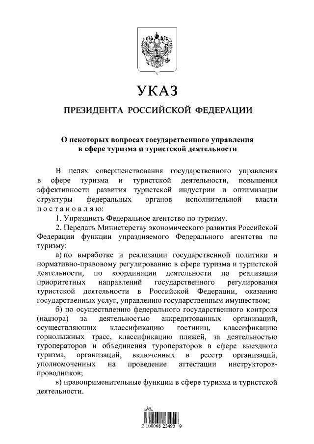 В указе сказано, что это сделано «в целях совершенствования государственного управления в сфере туризма», «повышения эффективности развития туристской индустрии» и «оптимизации структуры» федеральных органов исполнительной власти.