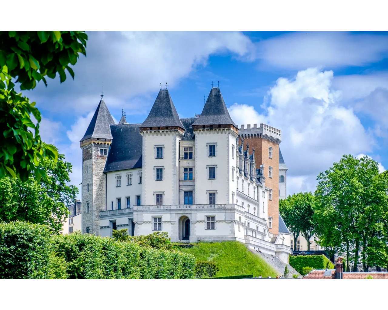 Существующие строения начал возводить Гастон III де Фуа, более известный под именем Гастон Феб. При нём был воздвигнут каменный донжон высотой 33 метра, на котором выгравировали надпись: «Febus me fe», означающую на местном наречии «Феб меня сделал». После испанского завоевания Наварры сменил в 1512 году замок в Олите в качестве основной резиденции наваррских королей и их двора, в связи с чем началась перестройка во вкусе Возрождения. В этом замке 13 декабря 1553 года появился на свет Генрих Наваррский — первый французский король из династии Бурбонов. В 1830-е последний король из этой династии, Луи Филипп, решив почтить память предка, распорядился украсить и заново обставить запущенную резиденцию. Масштабная реконструкция в духе романтизма была завершена уже в годы Третьей империи.