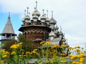 Далеко разнеслась слава Кижского погоста. Все постройки на острове деревянные. С древних времен до наших дней дерево в Карелии – основной строительный материал. Его мы видим в облике старинных крестьянских домов, древних церквей и часовен, мельниц и амбаров, собранных на острове! Здесь, на Кижах, под открытым небом собрано 68 памятников традиционной деревянной архитектуры. Жемчужина собрания по праву считается 22х-главая Преображенская церковь, высотой 37 метров ( дата постройки – 1714 г.)