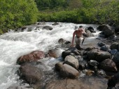 - На р. Дремучая в самом низу плато группа останавливается на ланч. Лошади расседлываются на отдых. Река Дремучая это приток р. Пиначевская, 26 км по левому берегу. Протекает в скалистом каньоне, имеет высокую скорость течения с перекатами и порогами, с длинной водотока в 18 км.